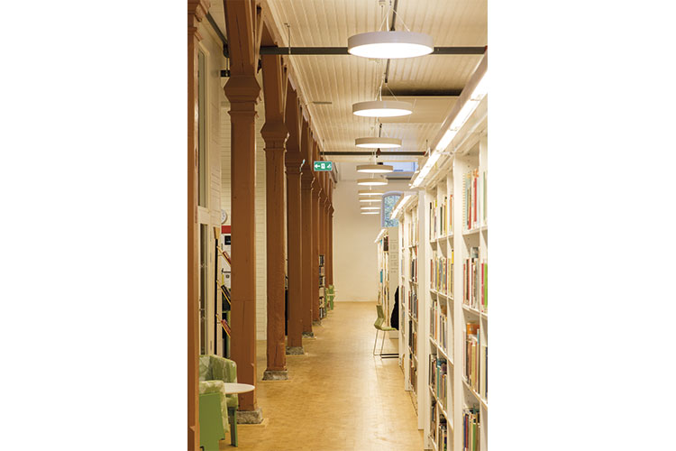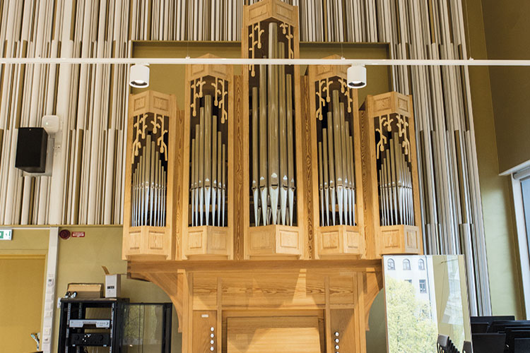 Väggarna fick inte ha invändiga kopplingsdosor eller uttag heller. Installationskanalerna har i stället monterats synliga i rummen. Fast i den praktfulla körsalen lägger man knappt märke till kanalerna vid en första anblick. De smälter diskret in i väggens akustikpanel, där avlånga så kallade diffusorer i guld och vitt reflekterar och sprider ljudet i rummet.