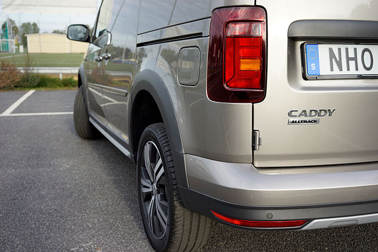 Caddy Alltrack känns exteriört igen på svarta kanter runt hjulhusen, svarta trösklar och stötfångare med hasplåtar i plast i underkant. På taket finns rails i silver och baktill är lampglasen mörktonade. Inne i kupén är stolklädseln mer stryktålig, pedalstället är i aluminium och ratt, växelspak och handbromshandtag är läderklädda.