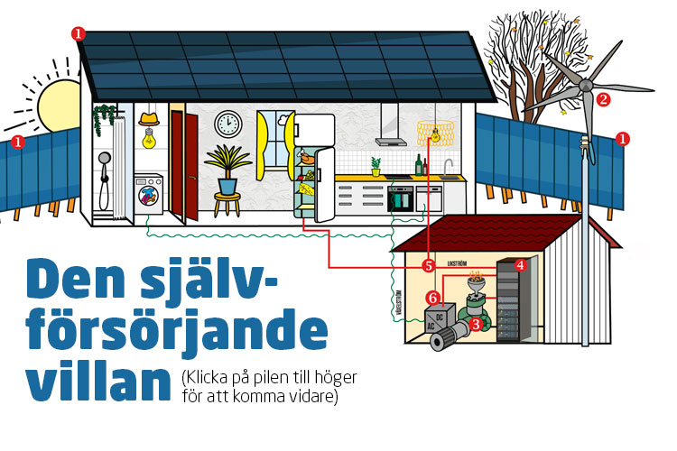 Villans namn syftar på att den ska klara sig utan anslutning till elnätet. Annars finns det finns gott om sladdar i huset, där Sandströms har gjort en stor del av elinstallationerna. Både för likströms- och växelströmsmatning. Men vi börjar med elproduktionen. Målet är att villan, som har byggts av fastighetsföretaget Sisyfos, ska kunna producera all el den förbrukar.