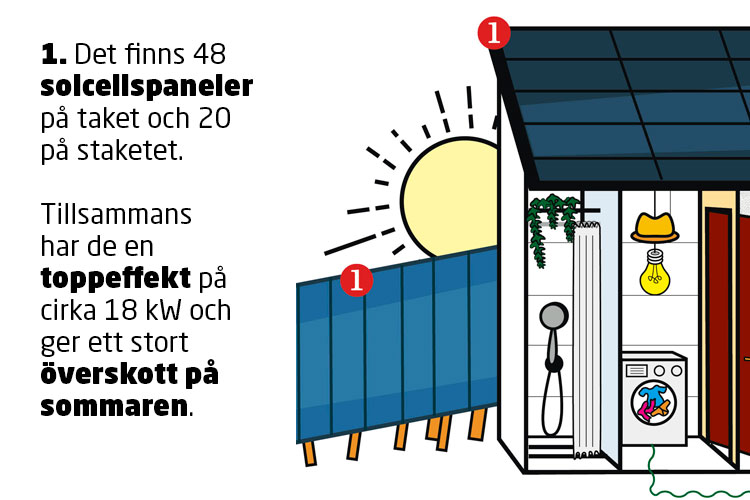 Huset har 68 solcellspaneler med en sammanlagd märkeffekt på drygt 18 kW, betydligt mer än vanliga villainstallationer. 48 av panelerna är monterade där solceller brukar sitta – på takets soligaste sida. De andra 20 panelerna sitter på två staket för att fånga vintersolens låga strålar.