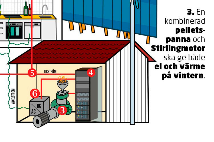 Nu under vinterhalvåret skall en Stirlingmotor skall bidra med såväl el som värme. Stirlingmotorer har använts länge i industriella sammanhang, och de kan drivas av värme från i princip vilken källa som helst. Här i villan ska värmen komma från pelletsförbränning. Att få tag på en Stirlingmotor för hemmabruk visade sig vara en utmaning, och motorn som beställts från Gävleföretaget Inresol blev försenad i några månader.