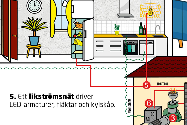 I det här huset är belysning, kylskåp och fläktar därför anslutna direkt till likspänningsnätet. Andra produkter har inte gått att hitta i DC-version.