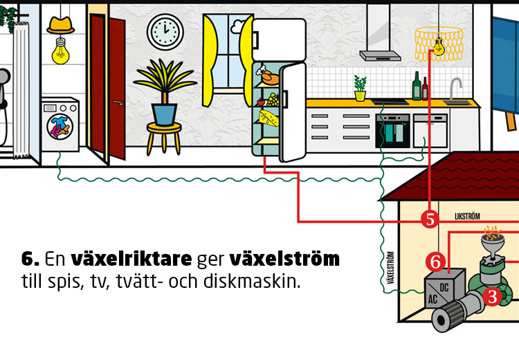 I det här huset är belysning, kylskåp och fläktar därför anslutna direkt till likspänningsnätet. Andra produkter har inte gått att hitta i DC-version. Spis, tv, disk- och tvättmaskin till exempel. När de ska användas måste växelriktaren först aktiveras på en kontrollpanel. Sedan slår man av växelriktaren av igen – allt för att spara energi.