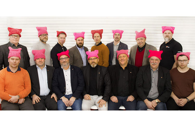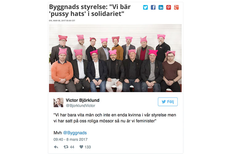 Byggnads hånas runt om på nätet och i sociala medier för att ha mer eller mindre kidnappat budskapet med sin ”pussyhat”-bild. På bilden poserar Byggnads styrelse, bestående av 15 vita män, i de rosa hattarna.