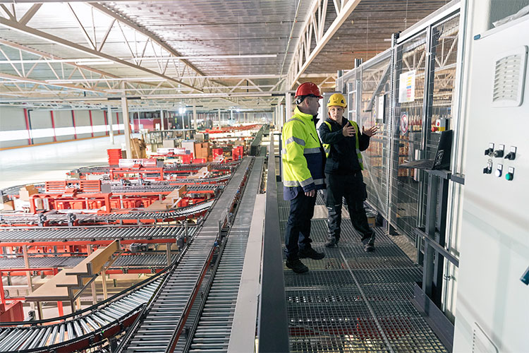 Något som utmärker det nya centrallagret är den mycket höga automationsgraden. Vi går förbi en rad med maskiner som både packar varor och viker kartongerna till anpassad storlek.