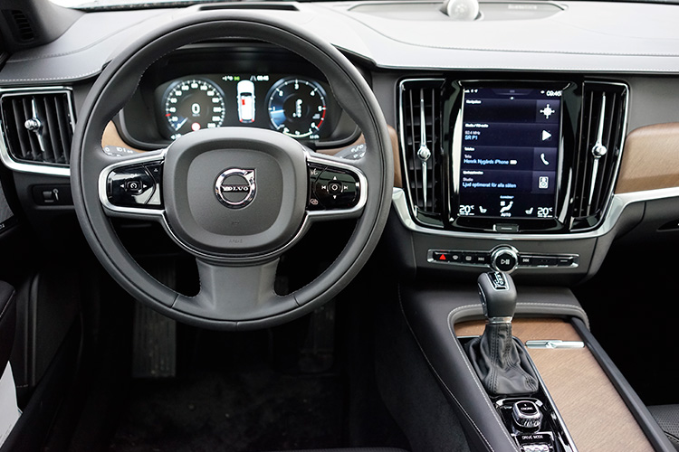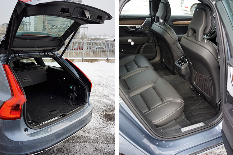 Högklassiga stolar har alltid varit ett adelsmärke för Volvo. Samtidigt var baksätesutrymmet i V70 dåligt för en så stor bil. I V90 är framstolarna fortsatt väldigt bra. Det är i baksätet det verkligen hänt saker. Där är utrymmet rejält tilltaget med gott om plats för långa, vuxna ben. Lite sämre utrymme är det istället i bagaget, inte på längden och bredden, men den sluttande bakluckan gör att det inte går att lasta på höjden hela vägen. Design har här fått gå före funktion.
