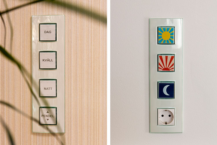 I lägenheterna är knapparna däremot lättillgängliga med tydliga symboler; sol, solnedgång och månskära.