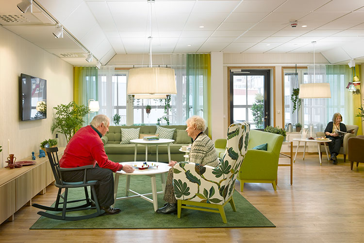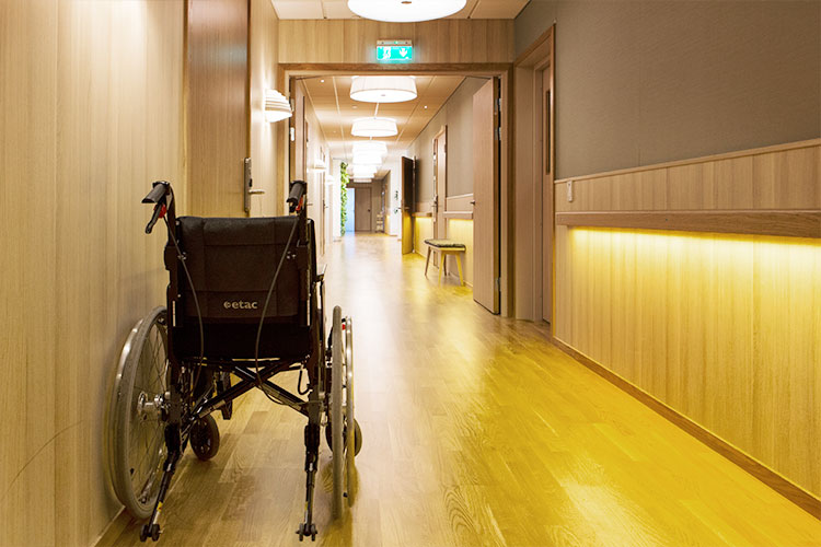 Ljuset är dämpat i änden av korridoren. Längre fram lyser det desto starkare så här i lunchtid. Nu ska de boende lockas att gå mot köket och allrummet i mitten av korridoren. Efter måltiden styrs armaturerna tvärtom: svagast vid avdelningens gemensamma utrymmen. Och framemot kvällskvisten dämpas belysningen ner i hela korridoren. Allt för att det ska kännas naturligt att ta sig tillbaka till den egna lägenheten och krypa till kojs.