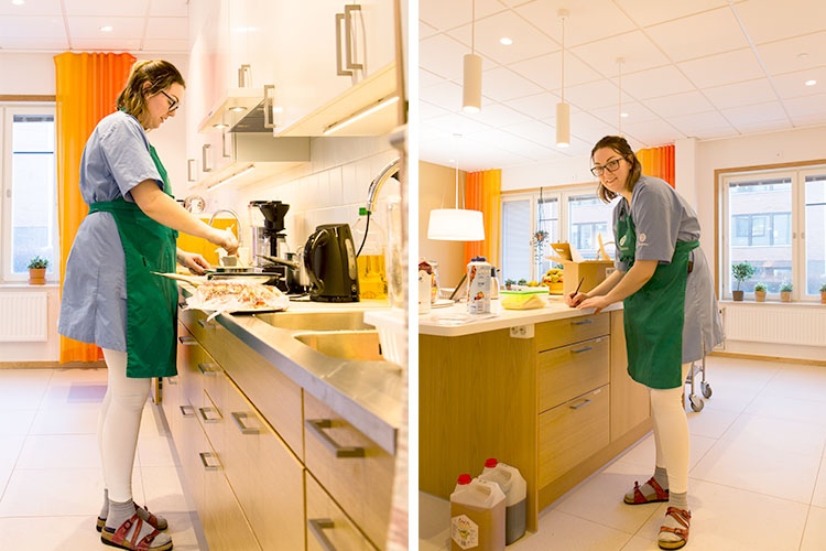 Undersköterskan Marielle Åkerlund, som står vid spisen och lagar rotmos, tycker att avdelningen är ljus och fin. Vid några tillfällen har de äldre klagat på att rummet är alltför ljust när de tittar på tv. Men det är lätt fixat.