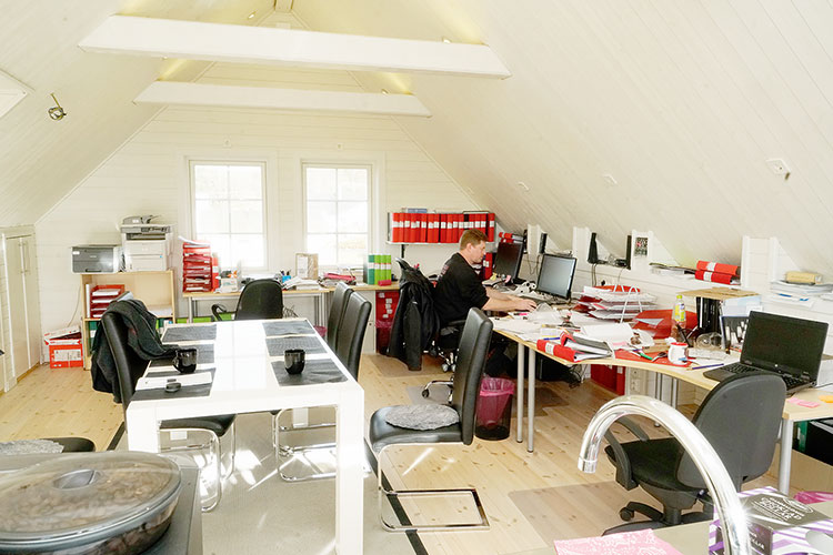 – Vi har inrett kontoret ovanpå garaget i vår villa, där vi byggde till en våning på ungefär 40 kvadratmeter. Där finns fikarum, toalett och arbetsplatser för oss sju som arbetar i företaget. Arrangemanget fungerar bra, men det återstår att se hur vi ska göra om vi blir fler.