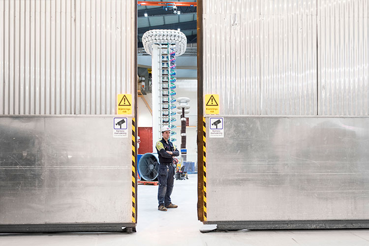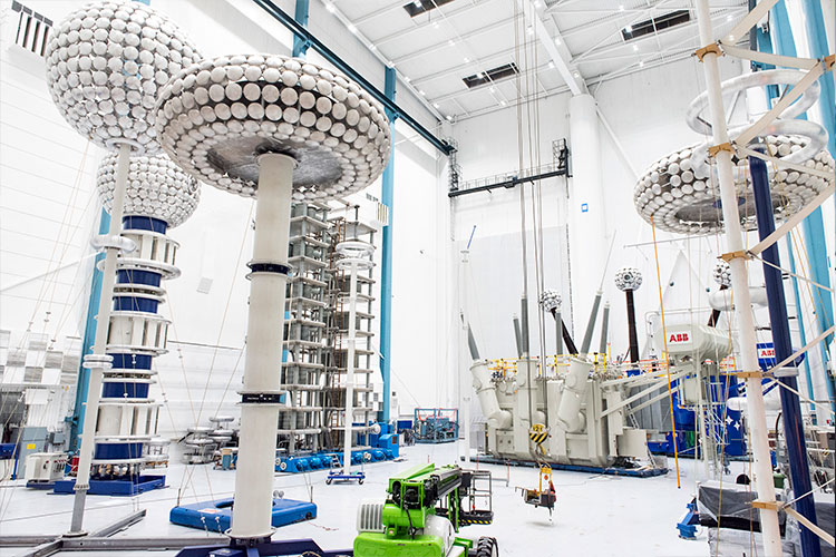 Den jättelika transformatorn väger 350 ton och är konstruerad för att klara 1 000 MVA. Bredvid den står ett torn med tolv våningar av kondensatorer som laddas upp parallellt, 400 kV per våning. På toppen av tornet sitter några så kallade koronaringar, svampliknande konstruktioner som byggts för att öka den yta som ansamlar den stigande spänningen. När spänningen närmar sig full provspänning (max 4,8 MV) ljuder en varningssignal och strax därefter genljuder hallen av en kraftig smäll, föregången av ett blixtsken. Transformatorn har utsatts för ett stötprov som simulerar ett åsknedslag i utrustningen. Urladdningen skapades genom att kondensatortornet laddades ur seriellt. Det hela är ytterst spektakulärt.