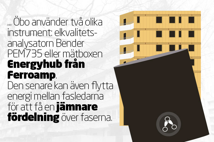Jonas TannerstadÖbo använder två olika instrument för strömmätningen: antingen elkvalitetsanalysatorn PEM735 från Bender eller mätboxen Energyhub från Ferroamp. Jonas Tannerstad visar skärmbilder med grafer från mätningarna. En ser ut som en svärm prickar i rött, grönt och blått – en färg per fas. Analysen av just de här mätvärdena avslöjade att en trefasig last på 700 Watt är ansluten dygnet runt. Mystiskt, eftersom det inte finns någon elpryl med den effekten som ska gå konstant i fastigheten. Efter lite klurande förstod Öbo att en cirkulationspump för värmeåtervinning stod på hela tiden, trots att den bara skulle gå vid vissa temperaturer. Felet fixades, energislöseriet kunde stoppas.