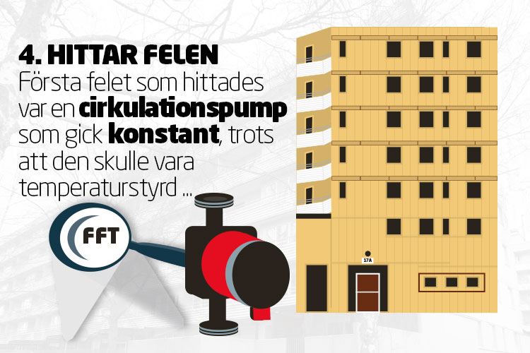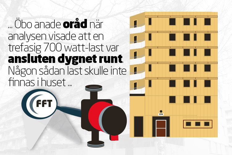 Den egenutvecklade tekniken för strömmätning kallas Fastighets-EKG. Hittills används den i drygt 20 av Öbos byggnader, däribland ett gult sjuvåningshus i området Brickebacken i utkanten av Örebro. Vi kliver in i elcentralen och spanar in ett svart mätinstrument på väggen. Här mäts strömmen som går genom huvudsäkringarna.