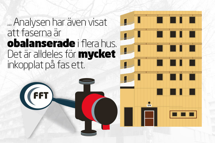 På en annan graf finns tre kurvor som visar strömmen i de tre faserna. En kurva ligger långt över de andra två; det är mycket mer last inkopplad på fas ett än på de andra faserna. Liknande obalanser har Öbo upptäckt i flera hus. Väldigt onödigt, tycker Jonas. Med bättre lastbalansering hade husen kunnat klara sig med svagare säkringar och lägre effektuttag.