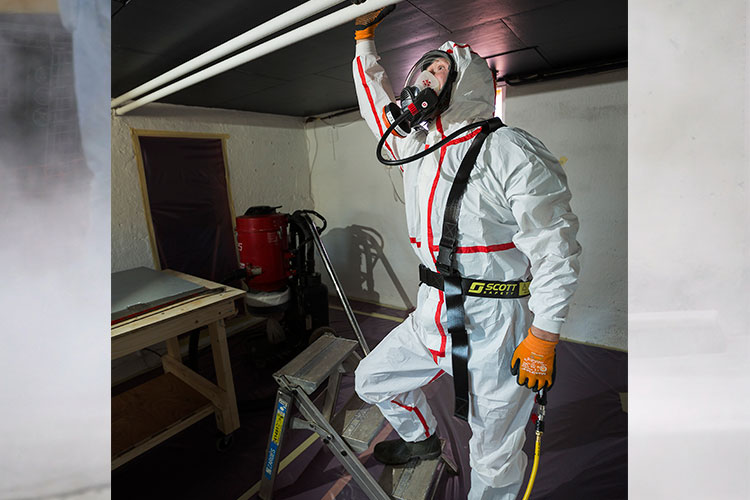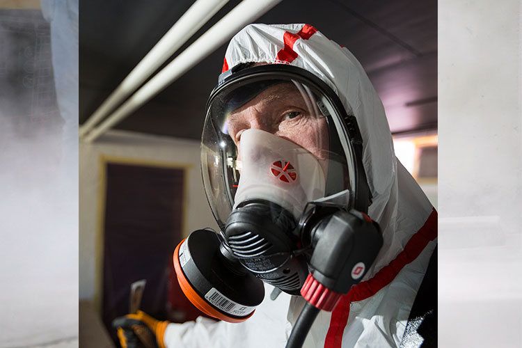 När han och kollegan Michael Säiner plockar ner material med asbest har de på sig heltäckande täta engångsskyddsdräkter med ansiktsmasker med luftintag. Ett par–tre timmar härdar de ut i dräkten. Sedan blir det allt för varmt och svettigt. Efter en paus måste de på med nya dräkter och göra om proceduren.