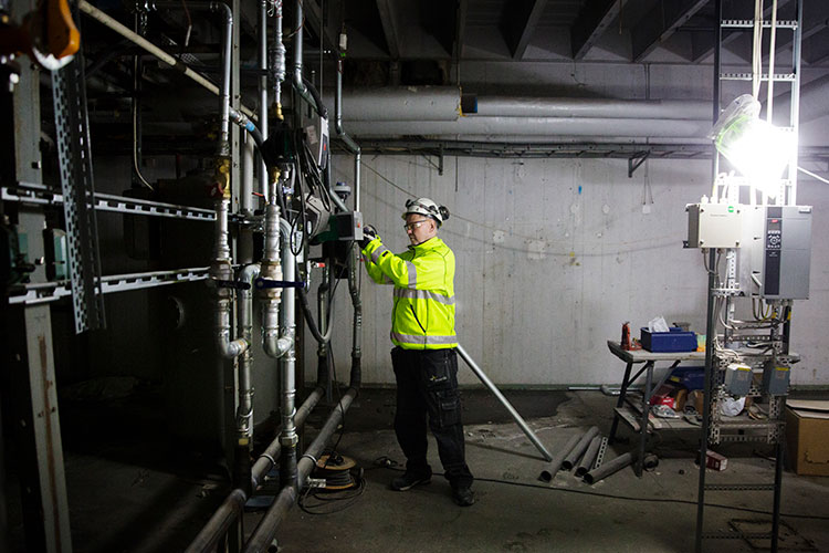 Martin förklarar att de många komplikationerna har gjort att installationerna ligger lite sent i tidsplanen just nu. Projektören Develcon, som svarar för projektering av kraft, belysning, tele och data, har arbetat sedan april förra året men måste då och då tänka om när förhållandena ute på bygget förändras.