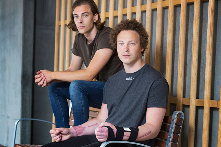 Efter fyra månader av operationer, transplantationer och andra behandlingar, en tid präglad av smärta och behovet att äta starka smärtstillande mediciner, ser Gustav Östermyr ganska fräsch ut, trots allt. Han är nitton år, ska snart fylla tjugo, ganska vältränad och väger styvt 100 kilo. Det var nog det som räddade honom.