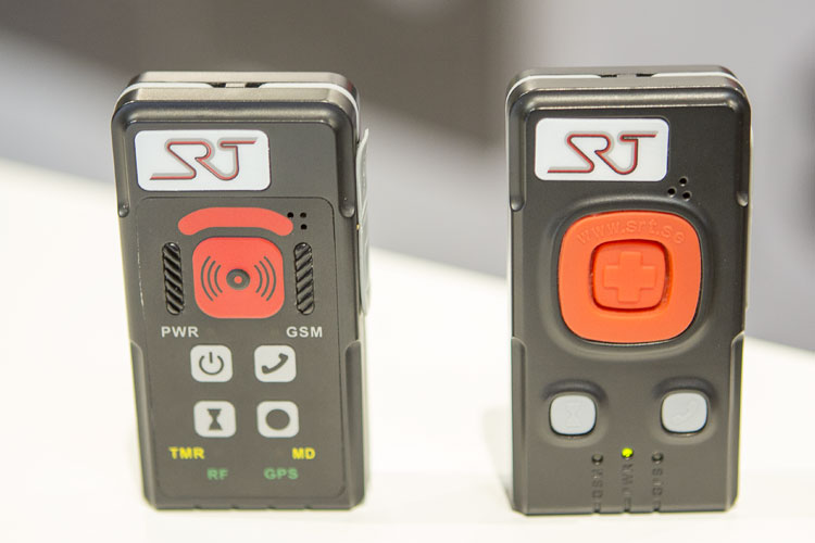 Viktor Fristedt SRT Personlarm berättar på mässan om bolagets senaste produkt som utöver gps också har en radiomodul för att kunna positionera inne i en byggnad.