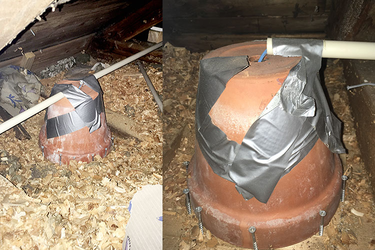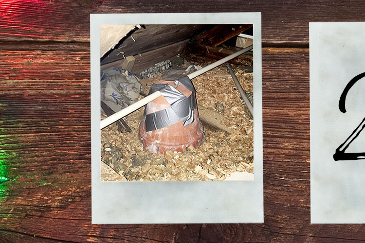 ”Detta hittades i ett hus utanför Halmstad på vinden ovanför en toa. Spottarna var Gu10 halogen 50W. Kunden hade haft Anticimex som gjort en koll och tyckte inte det såg bra ut.