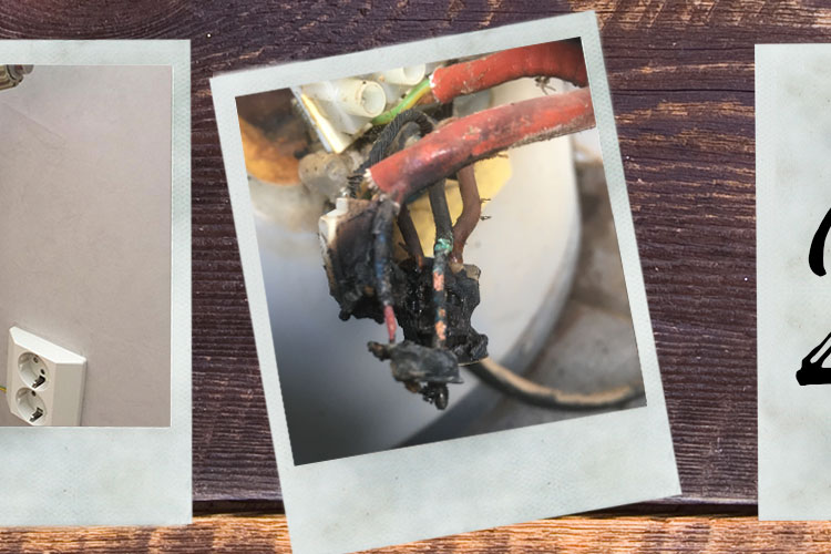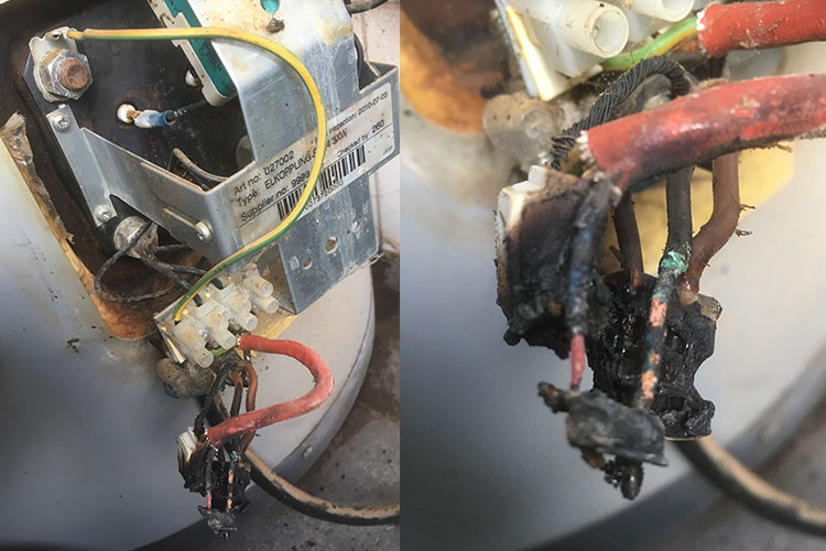 “Angående de uppmärksammade toppklämmorna från Wago och i det här fallet Solars snabbklämmor för doskopplingar: Här en varmvattenberedare som varit inkopplad före plint med dessa som övergång till anslutningsledning från kabel i installationen.