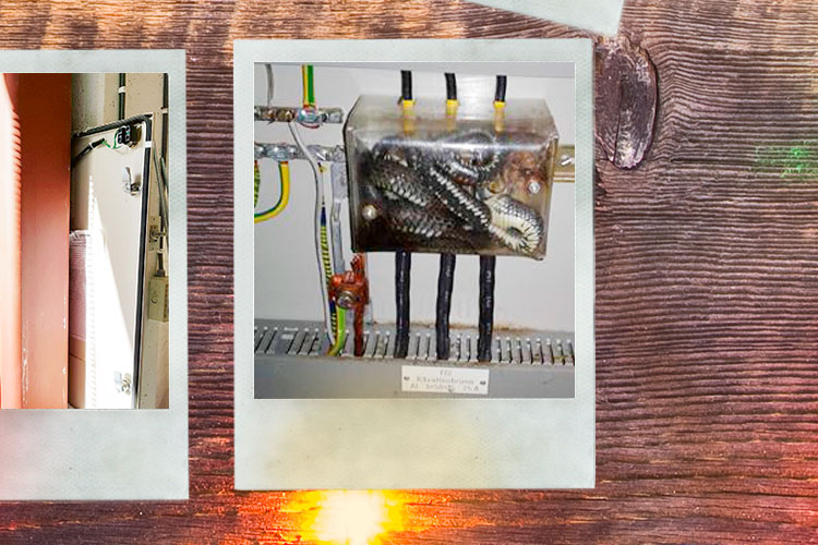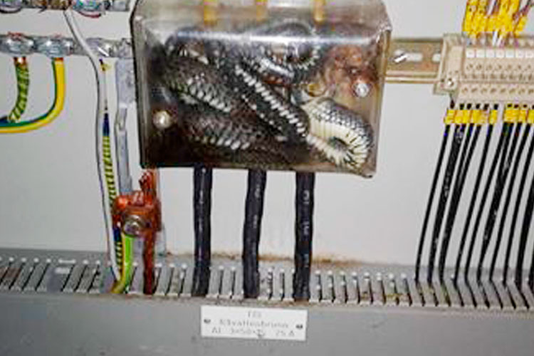 ”Vår montör i Vislanda råkade ut för lite annorlunda elfel. Två snokar som hade lyckats ringla sig in i en skarvplint Cu-Al på en anläggning i Alvesta Kommun.