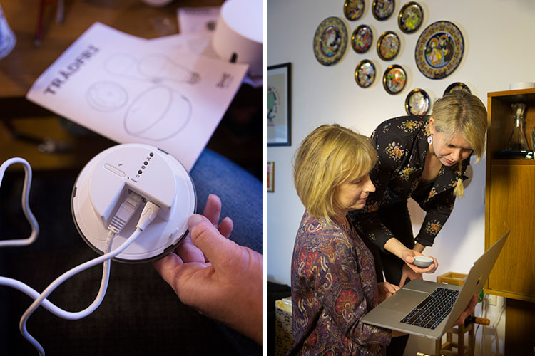 När vi efter lunchpausen kommer tillbaka hem till installationsprojektet hos Sofie Båtmästar river hon fram appen redan i farstun och tänder de tre styrbara Ikea-lamporna i vardagsrummet. Grymt!