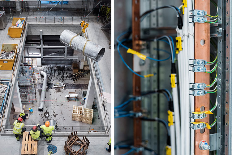 Inne i byggnaden är det många montörer i farten vid vårt besök. Pentair, som installerat värmekabel som ska förhindra att rörledningar fryser, var sena med sitt montage. Så Midroc har fått vänta med anslutningsarbetena. Nu gäller det att komma ikapp – det är inte lång tid kvar innan anläggningen ska köras i gång.