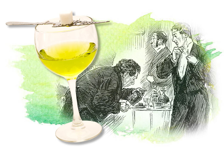 Häll absinten i ett glas. Lägg sockerbiten på en absintsked (eller något annat platt med små hål i) och droppa sakta isvattnet över sockerbiten så att den smälter ner i glaset.