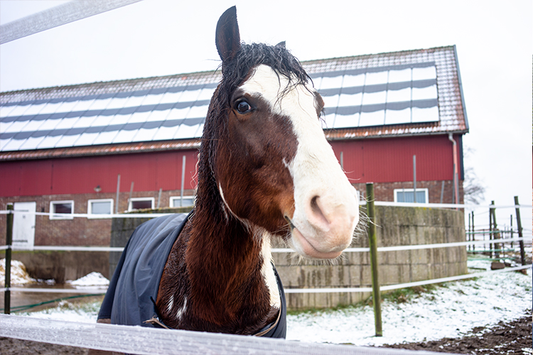 Nästa inspektionsobjekt är en hästgård som nyligen fått solceller på stalltaket. Här syns det redan från marken att kablarna hänger ner mot taket. En solcellsanläggning ska hålla i 25-30 år, och lösa kablar kan blåsa fram och tillbaka och skavas sönder med tiden. Det måste åtgärdas.