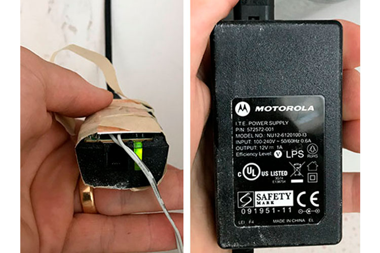 2:a pris går till Jakob Engström och hans bild ”I vårt kök renoverat av tidigare husägare började överskåpen sjunka sakta men säkert. Vi fann att installationerna till de 12V-spotar som satt i underkant med skåpen var ihopkopplad med mobilladdare! På en av laddarna i bild har man med lödpenna anslutit den vita kabeln som matar en slinga med spotar på 12V sidan av mobilladdaren för att sedan klippa isär och använda ett kreditkort som isolering för att slutligen dra ihop ekipaget med maskeringstejp.”