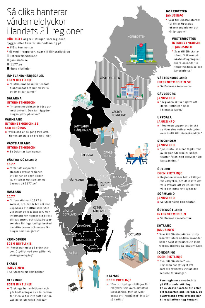 Föreningen för industriell elteknik, FIE,har gjort en stor undersökning av hur Vårdsverige hanterar elolyckor. Rapporten visar att vården skiljer sig stort i olika regioner.