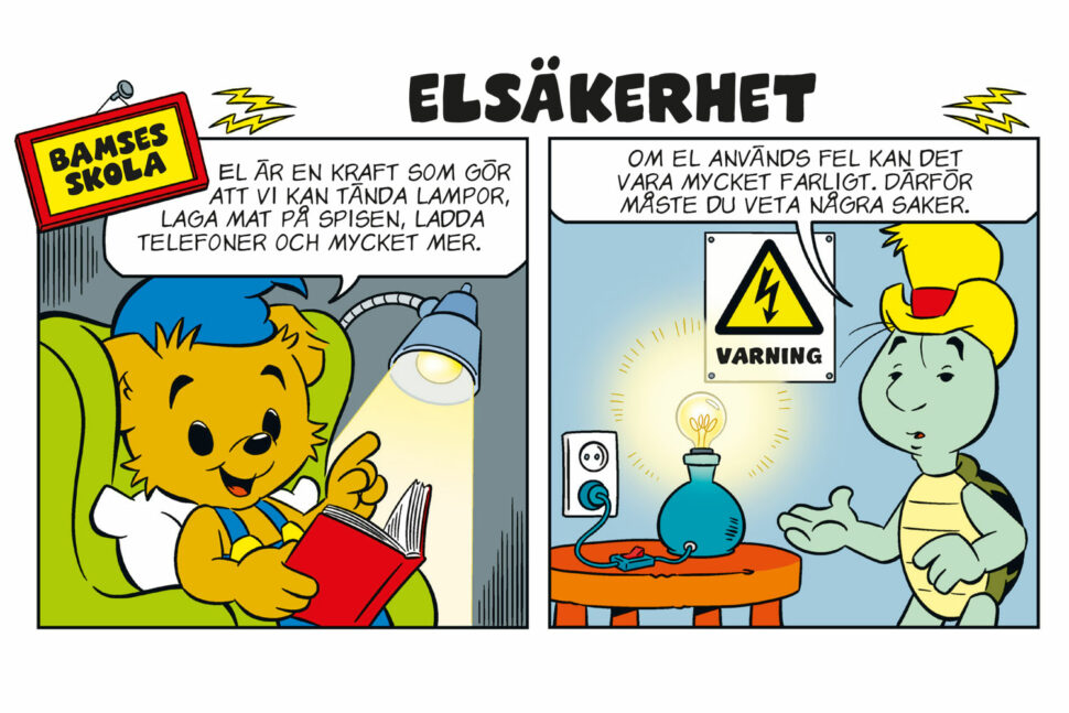 Pedagogiska seriestrippar där Bamse och hans vänner informerar om vad el är och hur man praktiskt ska undvika farliga situationer, till exempel genom att inte ladda på natten.