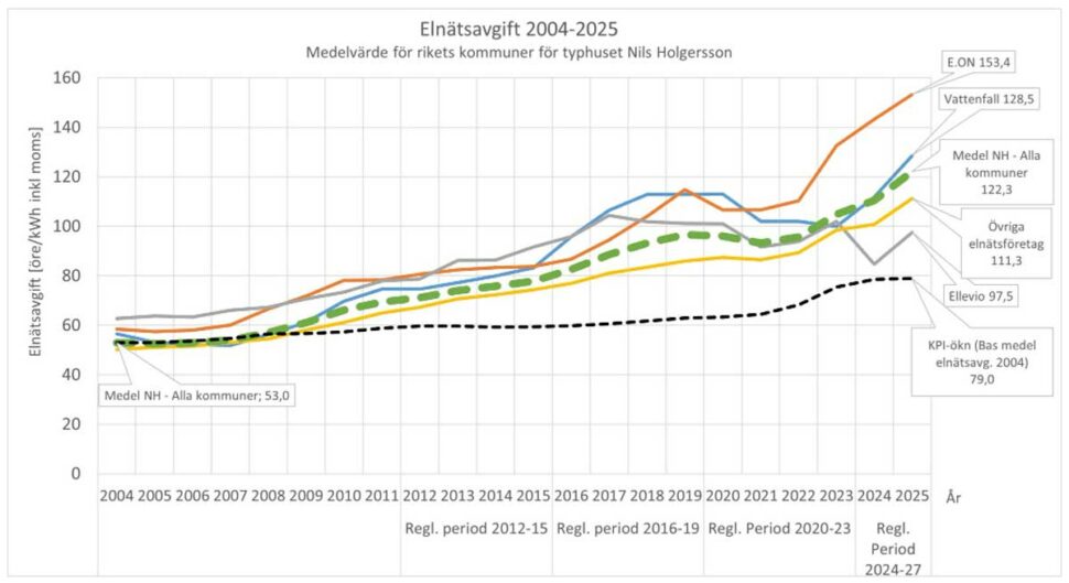 Falskt, det är Energimarknadsinspektionen som bestämmer en ram för hur höga elnätsavgifterna får vara. Men… På senare år har nätavgifterna ökat kraftigt. Enligt Nils Holgersson-rapporten 2025 höjdes elnätsavgifterna i snitt med 10,6 procent mellan 2024 och 2025 – den största ökningen på 30 år.