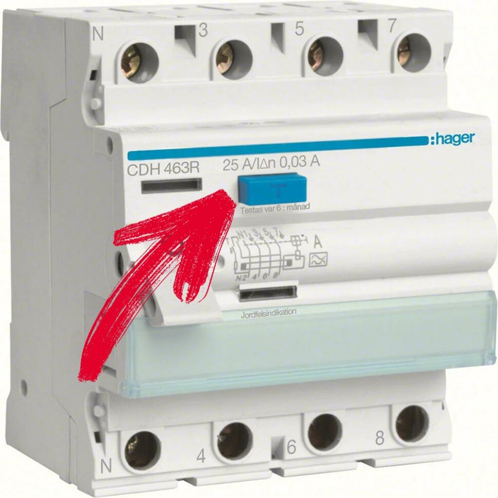 Alla jordfelsbrytare har även en testknapp och det skadar inte att trycka på knappen, för att säkerställa att spänningen försvinner ute i anläggningen.