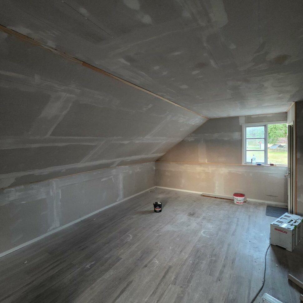 – På gården har jag en byggnad med ett större rum på övervåningen. Det tänkte jag skulle bli ett kontor och lager i framtiden, så jag har gipsat, lagt golv och isolerat där uppe.