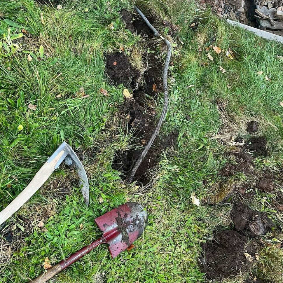 Han fick börja gräva fram matningen med spade och det visade sig att vatten hade runnit in i slangen och orsakat en kortslutning.