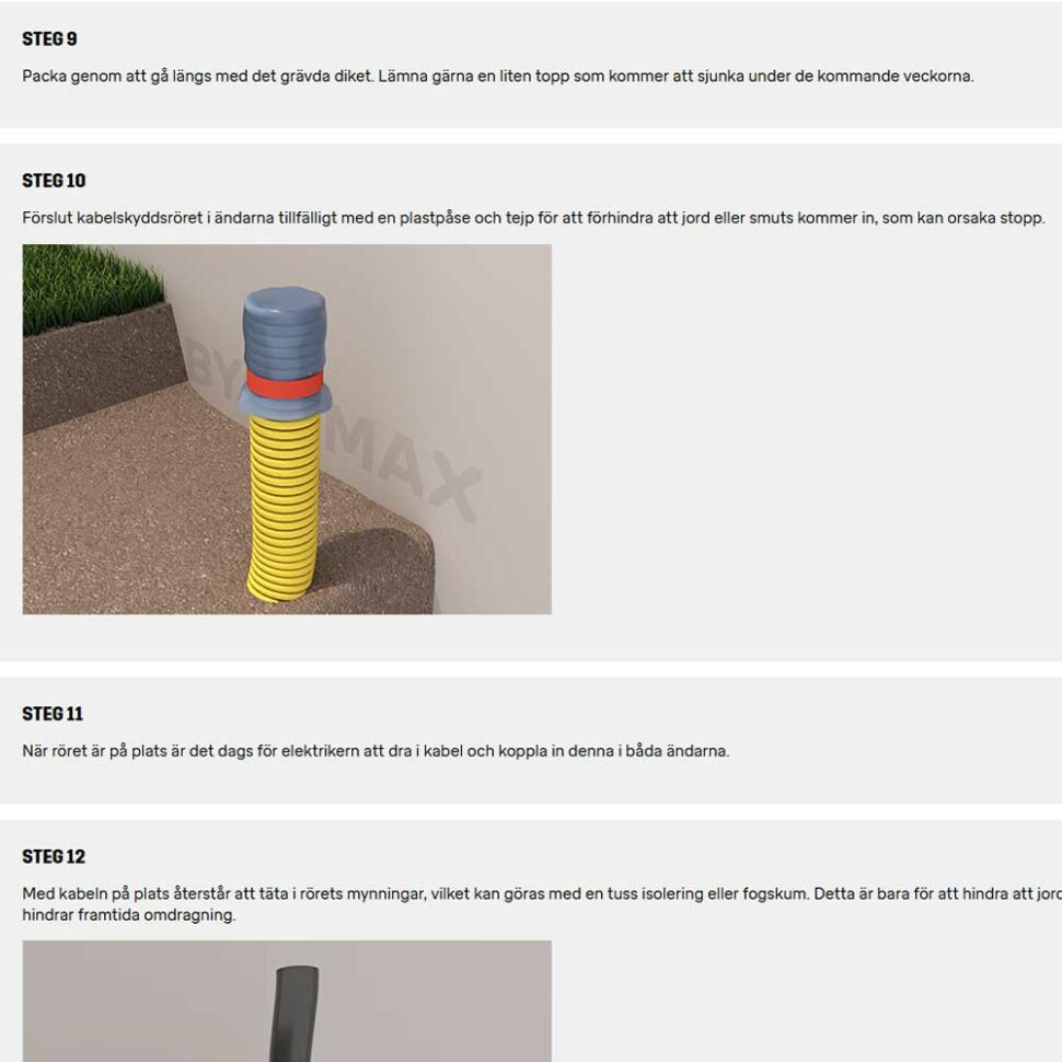 På sin hemsida har Byggmax en guide för hur man drar el i mark. ”Grävjobbet eller nedläggningen av kabelskyddsröret är inte svårt, men det finns lite regler att ta hänsyn till”, skriver byggvaruhuset på webbplatsen.
