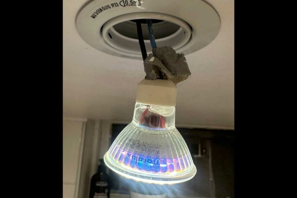 – Det var en klåpare som renoverade huset vi köpte. I korthet så var det förra ägaren som renoverat och satt spottar lite här och var i huset. Till denna modell av spottar ska det egentligen finnas en plastdosa, där anslutningen sker, som sedan löper vidare till en sockel för spottar. Av någon anledning så virade man kabeln runt varje anslutning på lampan istället och tejpade, säger Rasmus Silverin till Elinstallatören.