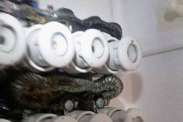 När elinstallatören Kenneth Olsson öppnade kåpan till en elcentral som skulle bytas fick han en chock. Runt propparna hade en stor huggorm lagt sig att vila.