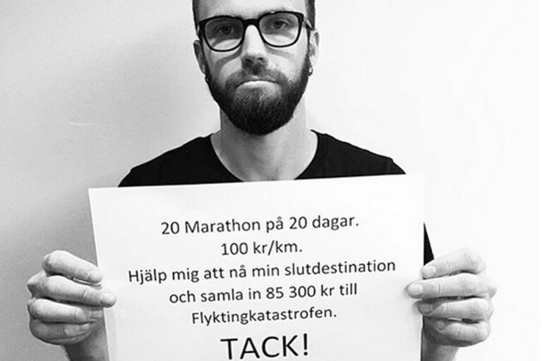 Ljusföretagaren Jonas Bergström springer 20 maraton på 20 dagar för att samla in pengar till flyktingkatastrofen. Målet var att samla in 100 kronor per kilometer från Stockholm till Piteå där Jonas ska delta i en konferens, men efter all uppmärksamhet har målet redan nåtts.