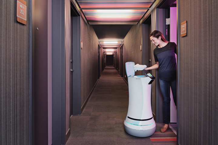 På hotell Aloft i Cupertino i Kalifornien levereras rumsservicen av en robot. En kamera, sensorer, trådlös datakommunikation och ett system för självladdning gör att den 90 centimeter höga roboten klarar sina arbetsuppgifter.