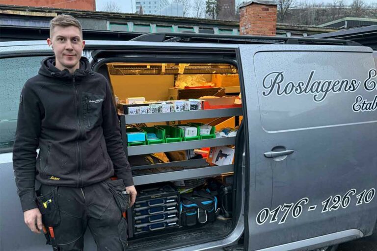 Dubbla sidodörrar och proffsbyggd inredning som montören själv får välja. Så jobbar Roslagens Elektriska med sina servicebilar. Hur gör du?