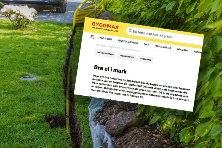 ”Dags att fixa belysning i trädgården? … eller sätta upp en laddbox på uppfarten?” I sin guide nämner Byggmax inget om att förläggning av kabelskyddsrör är ett elinstallationsarbete som kräver auktorisation.