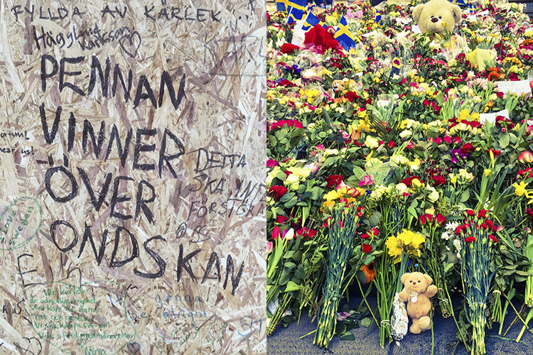 Spåren efter terrorn på Drottninggatan är nu övertäckta med blommor, ljus och kloka, varma ord från medmänniskor i Stockholm.
